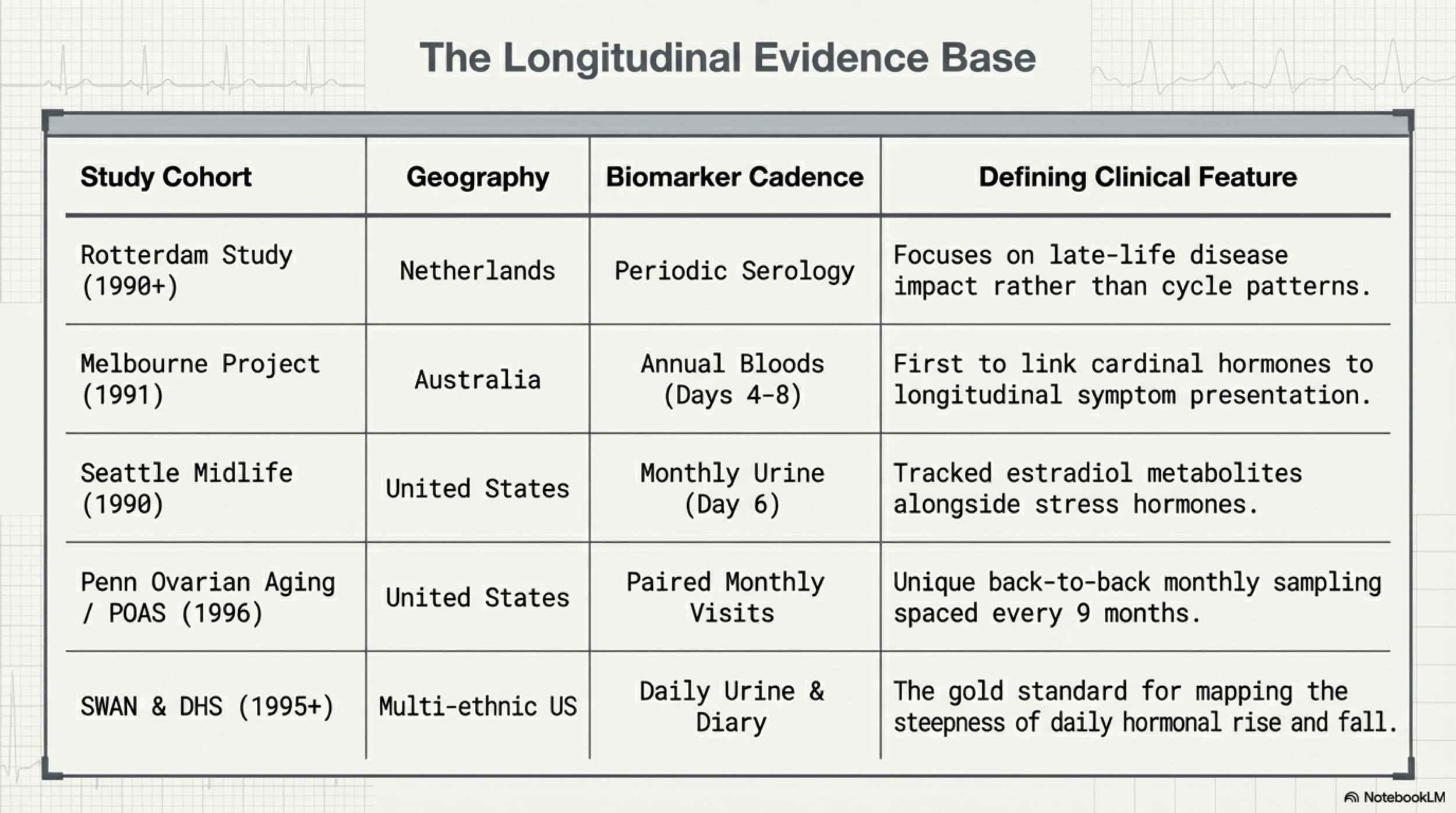 The quality of what we understand about perimenopause depends entirely on how it was studied. A cross-sectional study gives you a single snapshot — useful for spotting patterns, but unable to show how any one person changes over time. Because sex hormones fluctuate far more consistently within an individual than across a population, the most valuable research is longitudinal — following the same women over years.