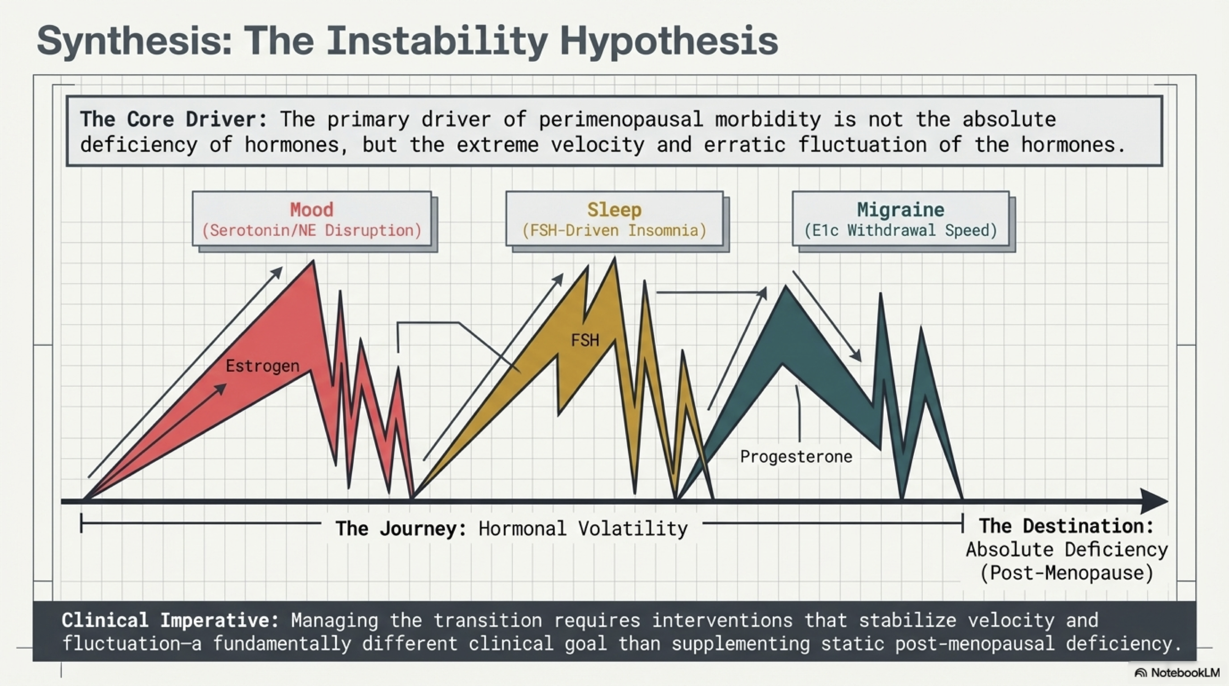 The dominant hypothesis in this field reframes perimenopausal symptoms entirely. Research suggests that the speed and amplitude of hormonal swings — the peaks and troughs — cause more disruption than absolute hormone levels alone. This is the Erratic Fluctuation Hypothesis, and it changes how we interpret nearly every symptom of this transition.