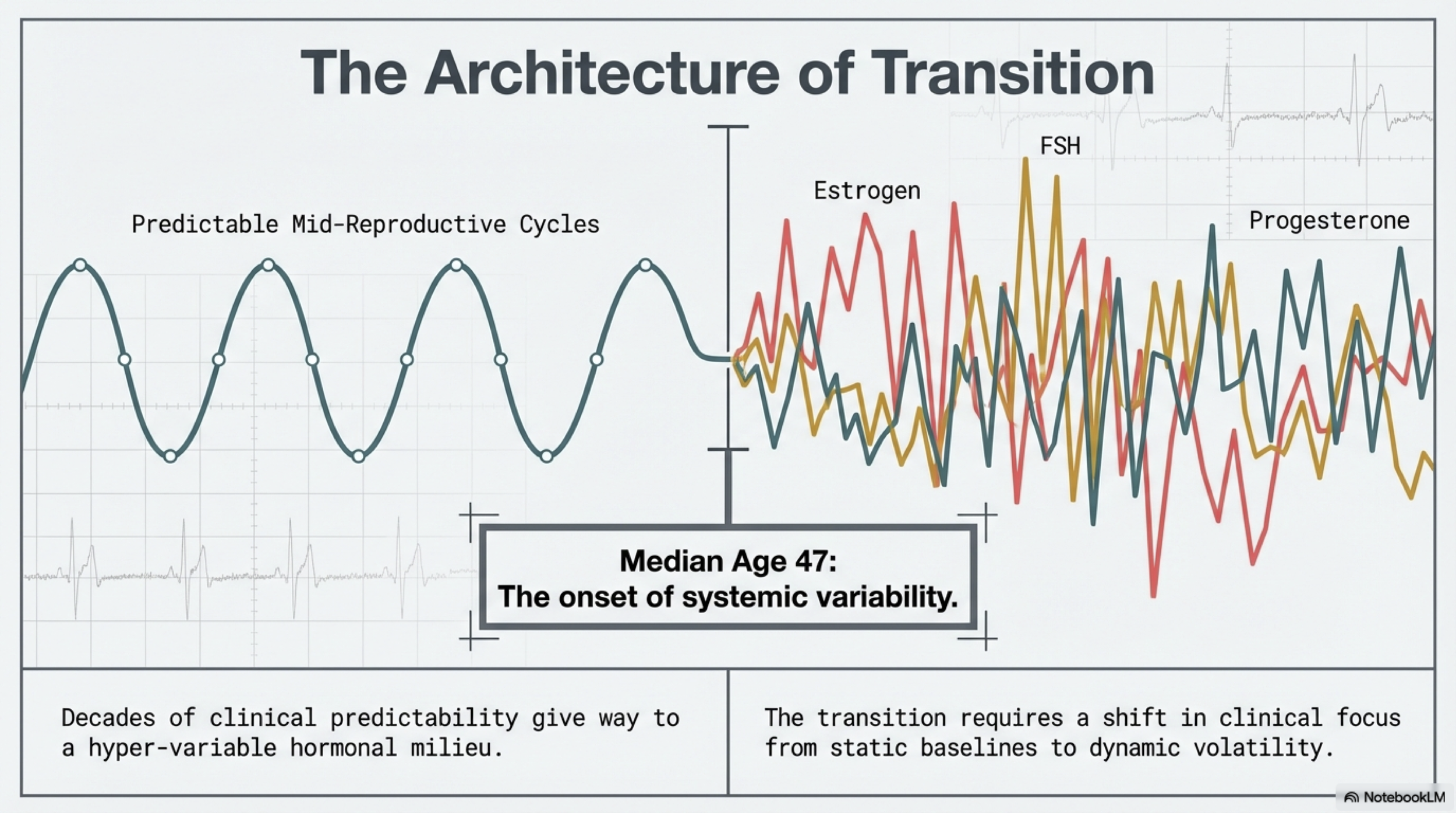 Your chronological age is also a surprisingly poor predictor of where you are in this process. While the median age for the transition to begin is around 47, the more telling indicators are the hormonal shifts happening beneath the surface — often before your cycles show any outward disruption.